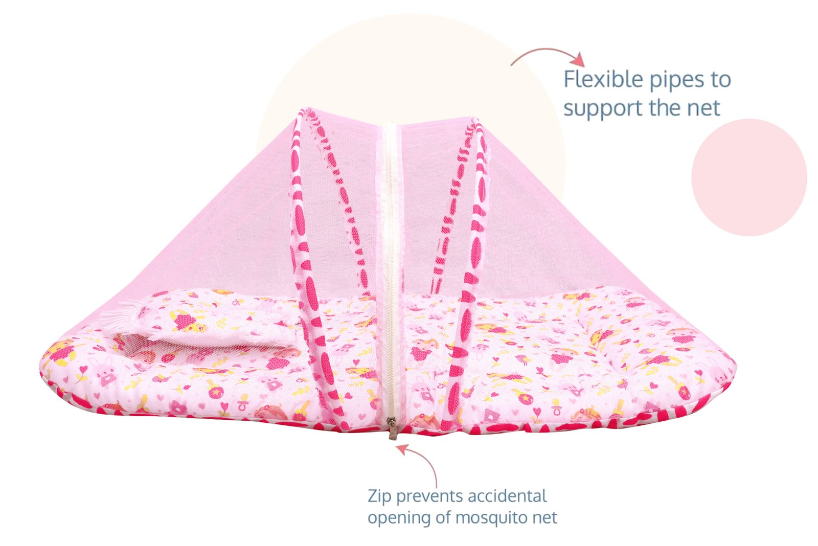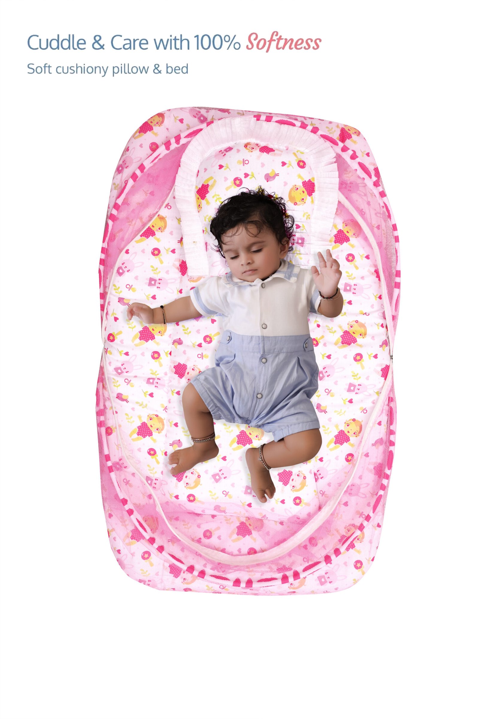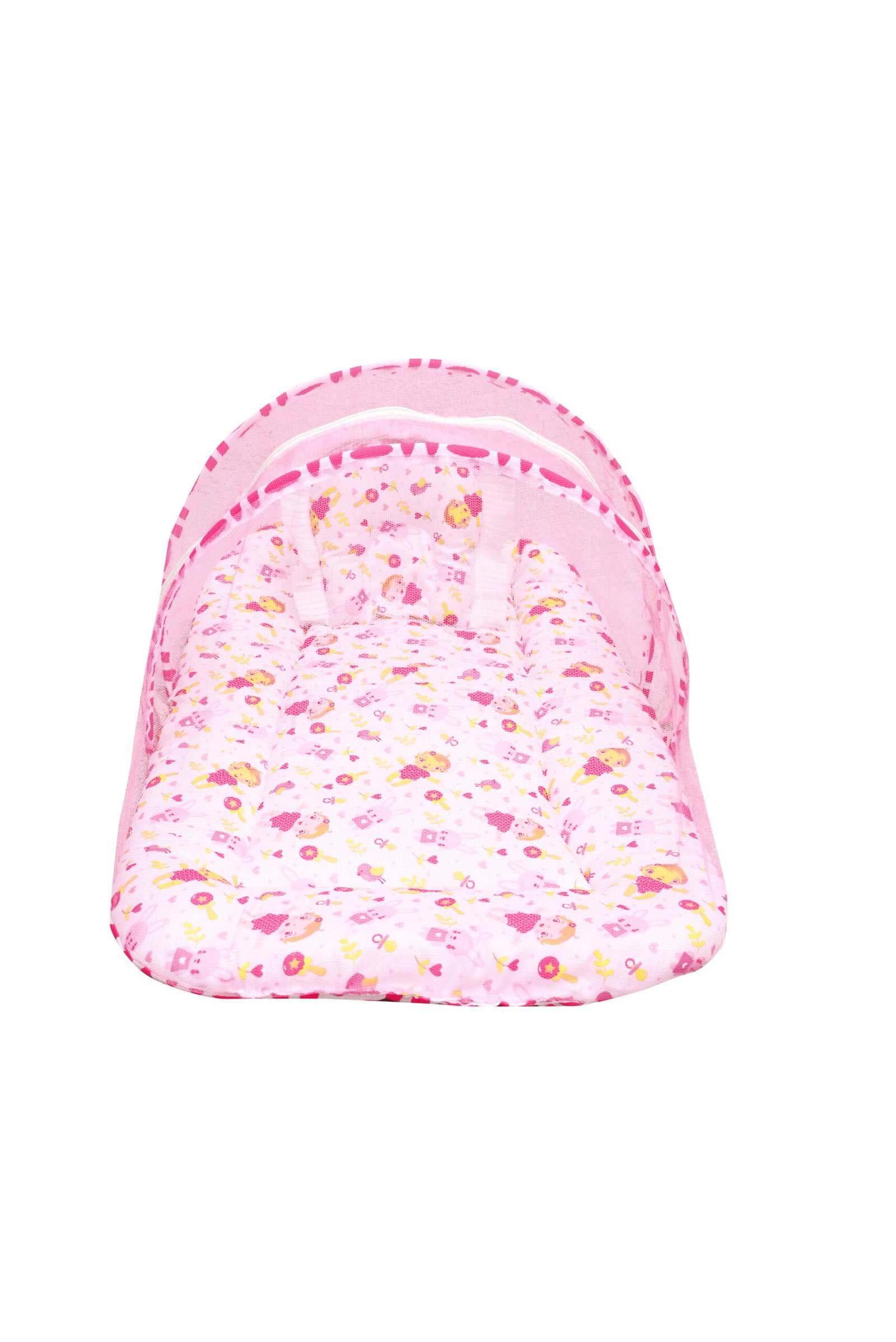GODADI WALA Present Print Cotton Bedding Set Thick Base Foldable with Mosquito Net and Head Pillow – Zip Closure (pink baby & bird)