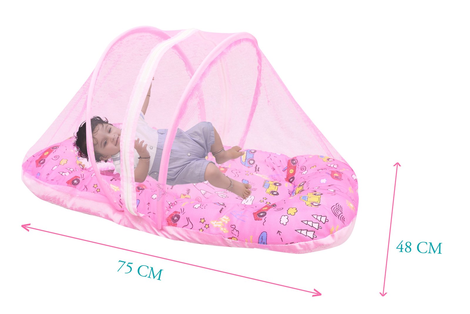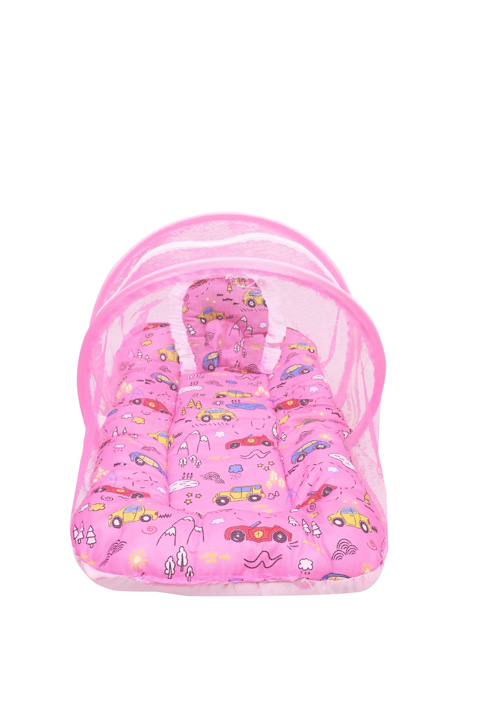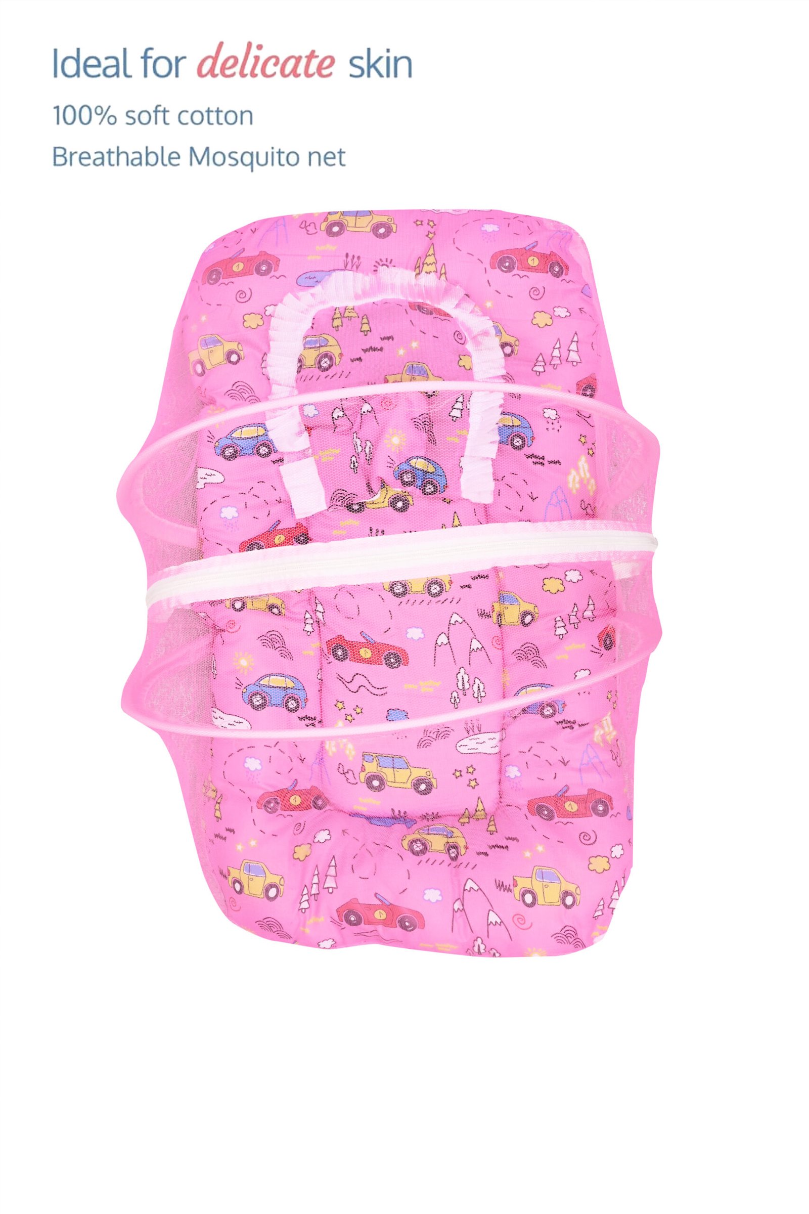 GODADI WALA Present Print Cotton Bedding Set Thick Base Foldable with Mosquito Net and Head Pillow – Zip Closure (pink car)